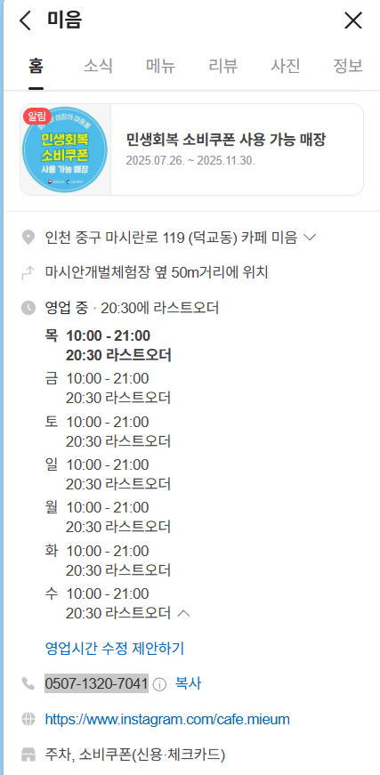 - 영업시간: 매일 10:00 ~ 평일·주중 20:00, 금·토·일 21:00 (라스트 오더 1시간 전)