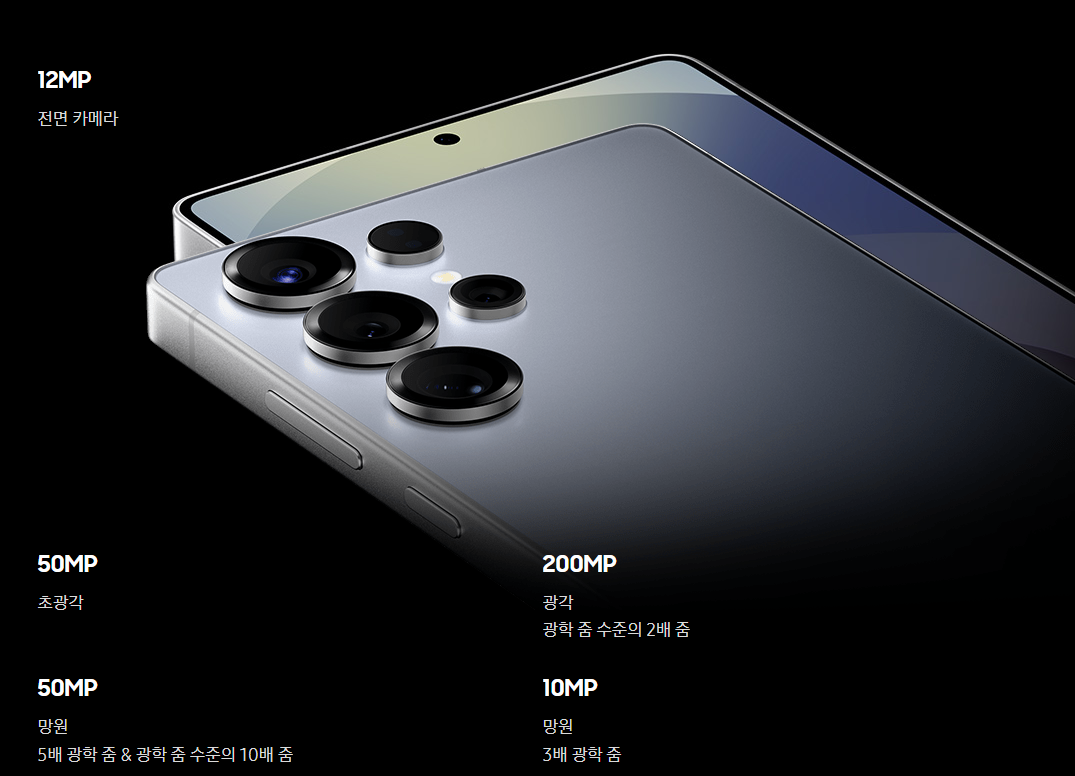 | 갤럭시 S25 울트라 | 200MP | 12MP | 50MP (5배 줌) + 10MP (10배 줌) |