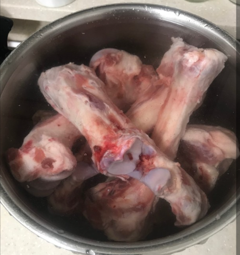1) 큰 냄비에 돼지 사골과 물을 넣고 센 불에서 끓입니다.