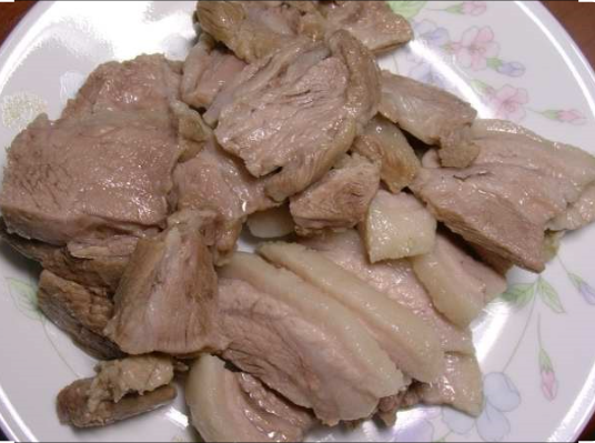 3) 삶은 돼지고기: 얇게 썰어 준비된 고기 사진