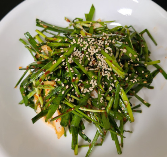 5) 곁들임 반찬: 부추 무침, 깍두기 등과 함께 차려진 식탁 모습