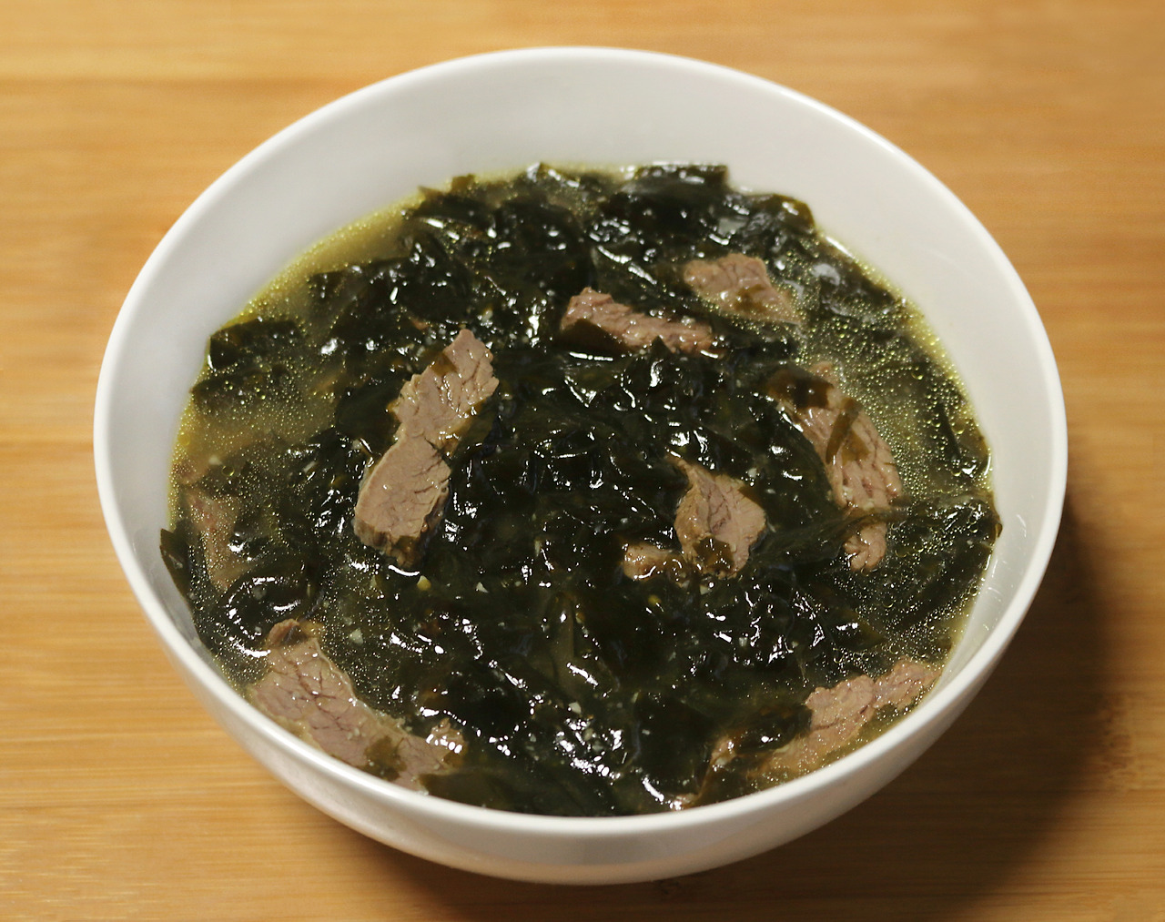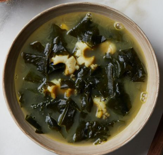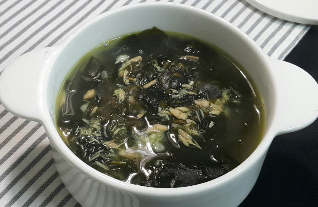 홍합이나 바지락을 넣어 시원한 맛을 내는 미역국입니다.