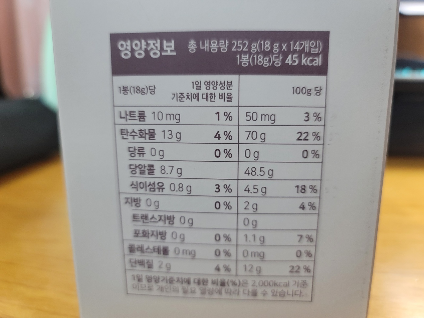 - 칼로리: 1봉지(18g)당 약 45kcal
