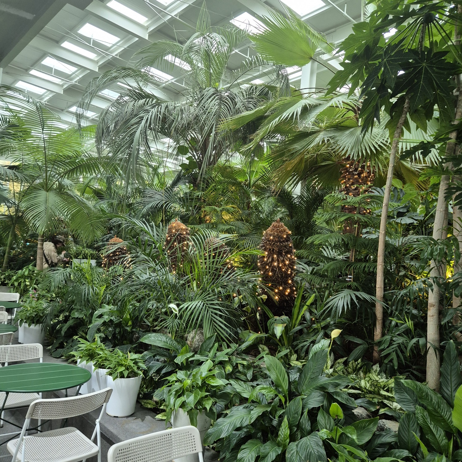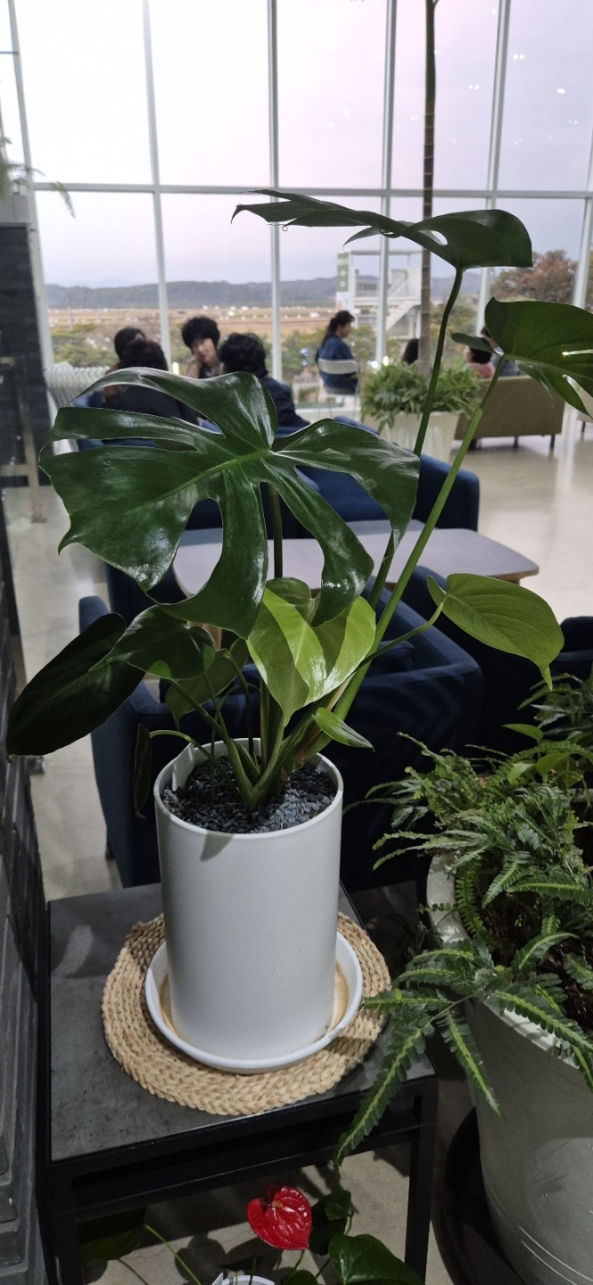 - 추천 포토존: 벽면에 꾸며진 대형 꽃 장식, 유리창 너머의 자연 풍경