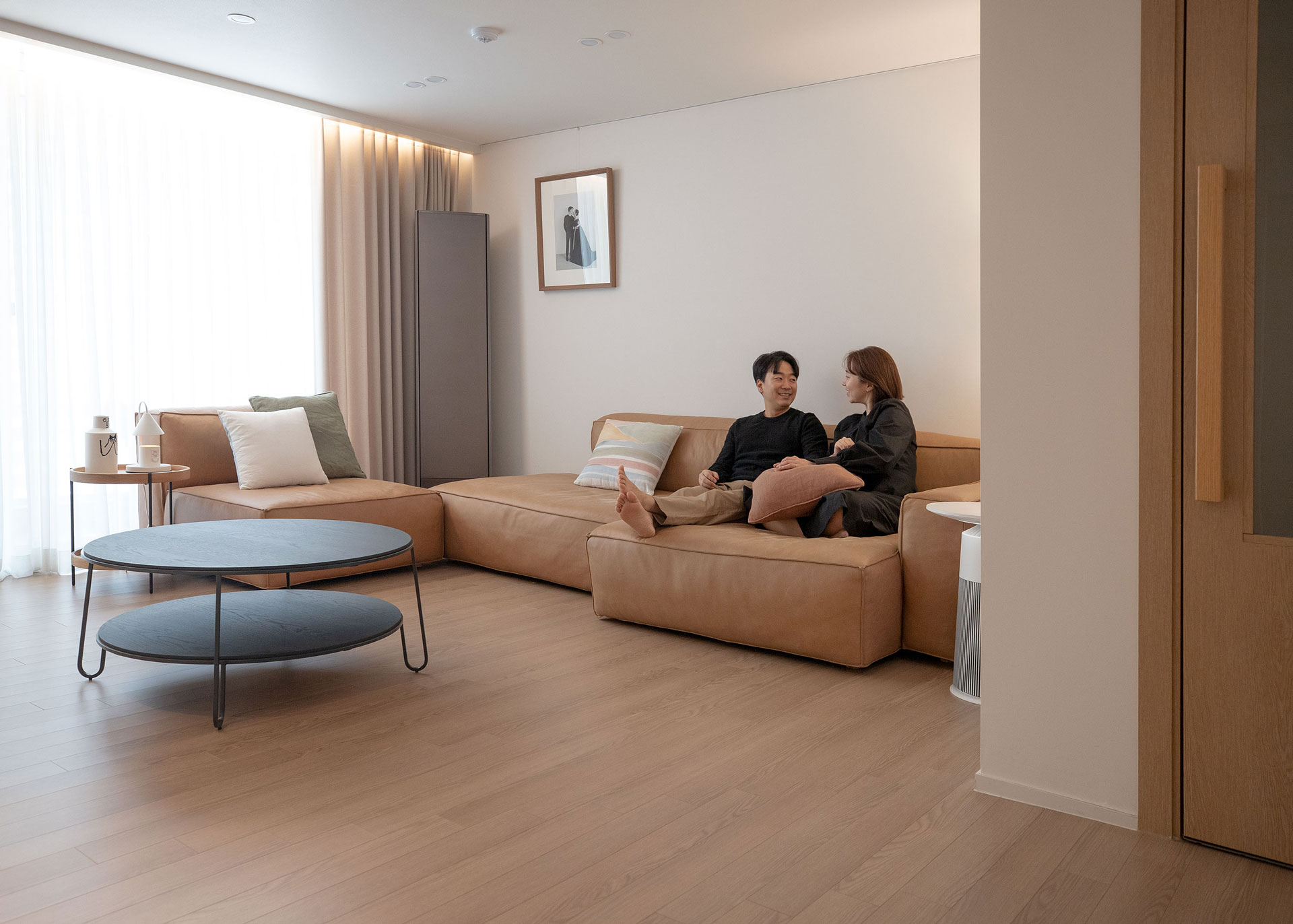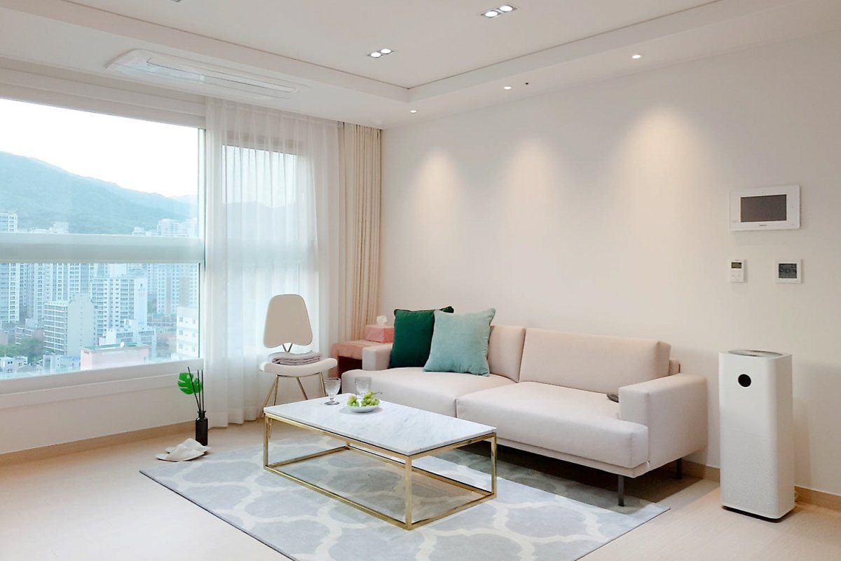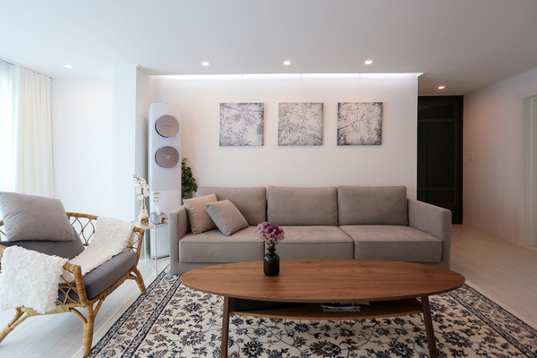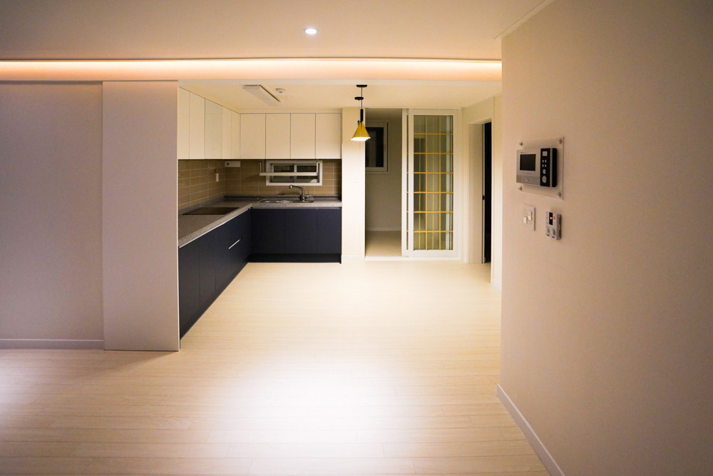 - 주방은 ㄱ자형으로 벽에 붙이고, 거실은 미니멀한 가구로 구성