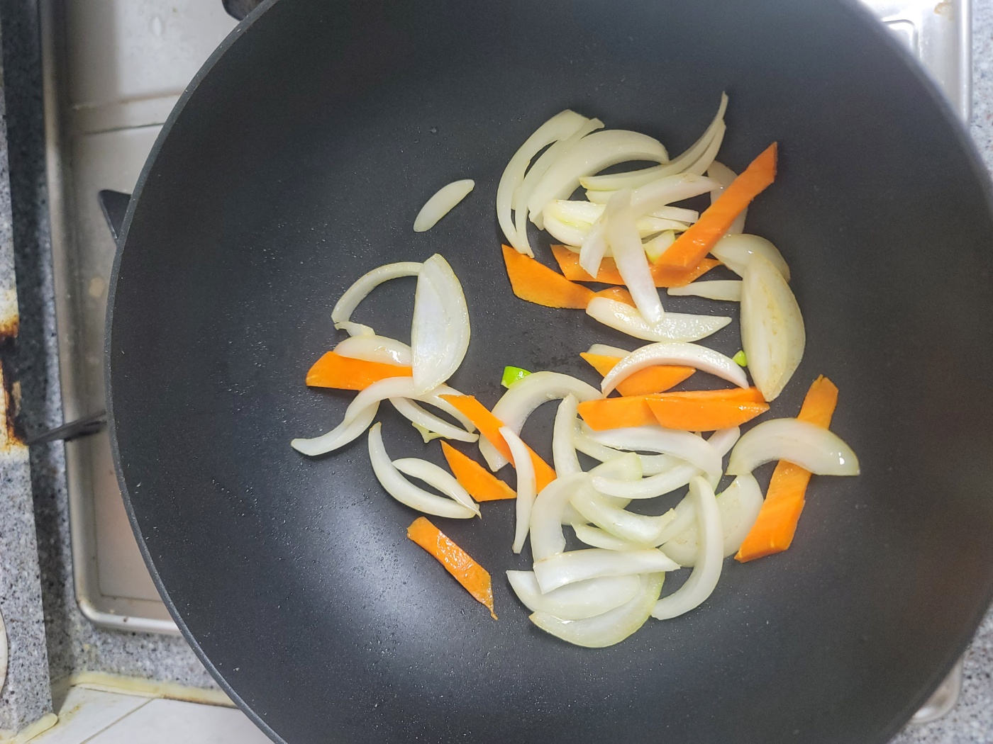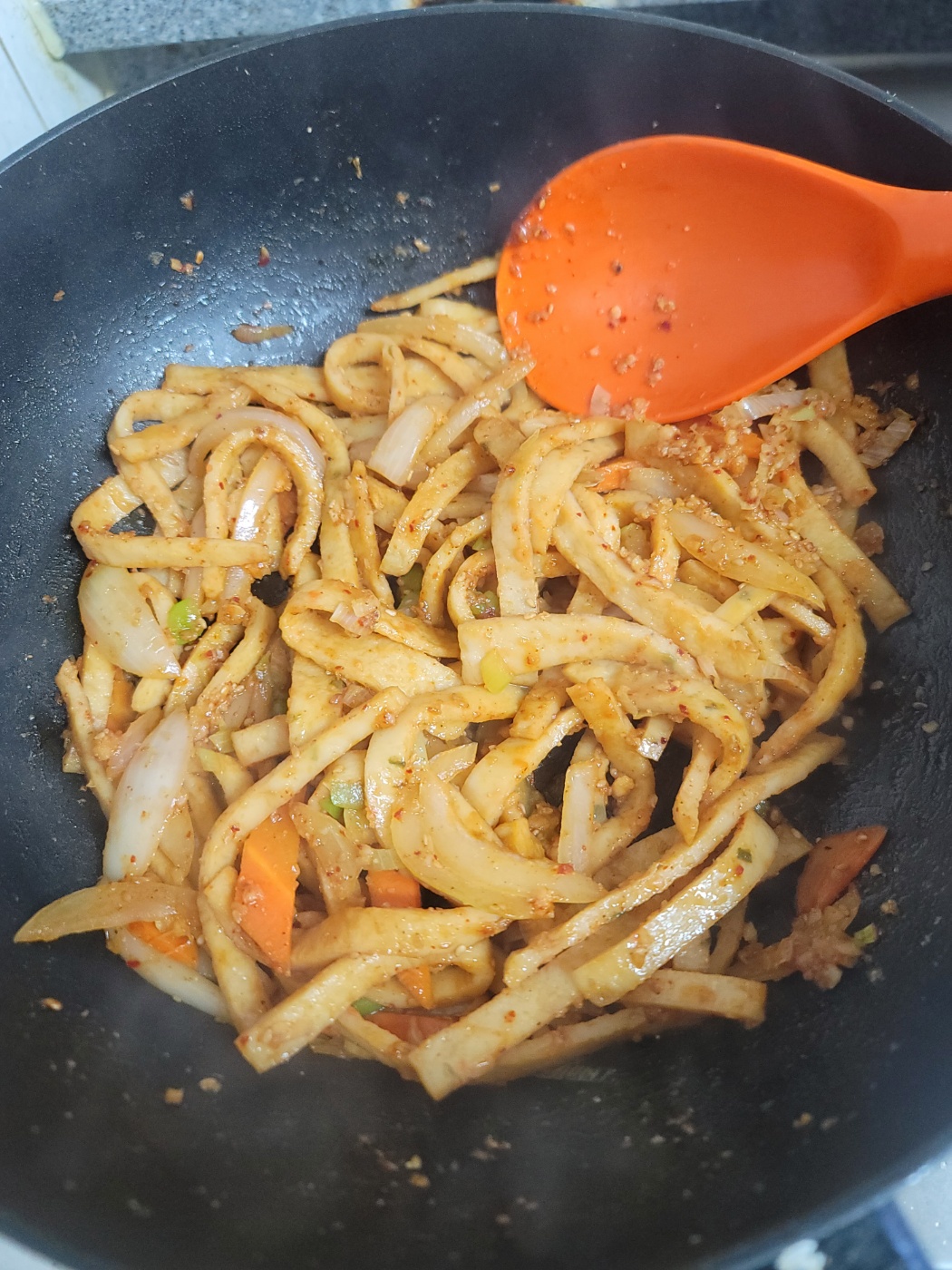 - 채소(양파와 당근)를 넣고 살짝 볶아준 후, 준비한 어묵을 넣어줍니다.