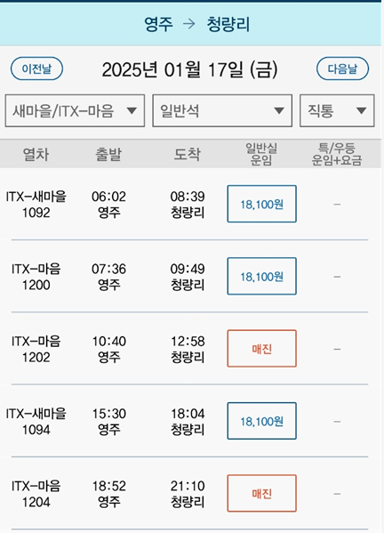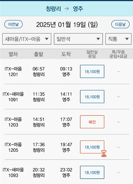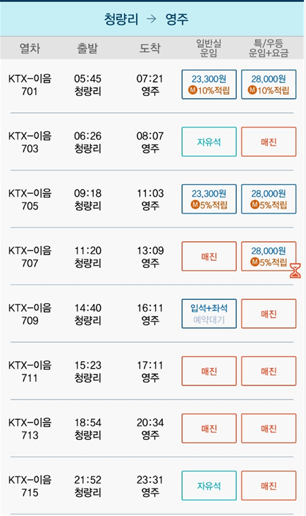 | 청량리 | 풍기 | 1시간 33분 | 21600원 | 25900원 |