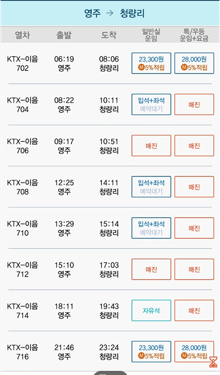 | 청량리 | 영주 | 1시간 36분 | 23300원 | 28000원 |