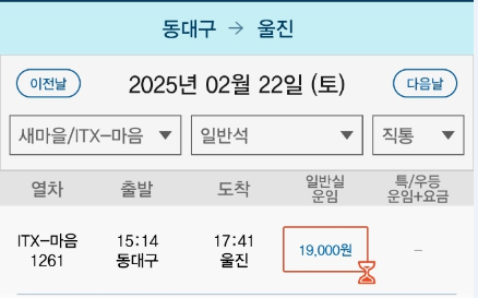 | 15:14 (1대) | 동대구 | 울진 | 약 2시간 30분 | 19,000 |