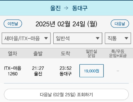 | 21:27 (1대) | 울진 | 동대구 | 약 2시간 30분 | 19,000 |