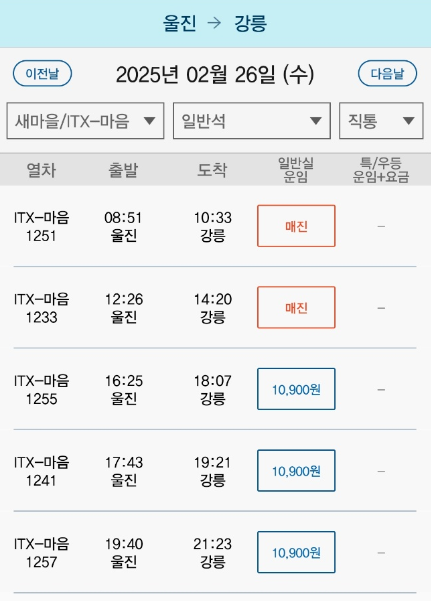 | 08:51 (5대) | 울진 | 강릉 | 약 1시간 40분 | 10,900 |