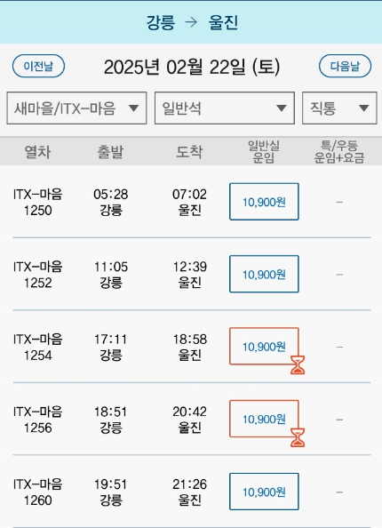 - 출발역(울진)과 도착역, 날짜, 시간 선택