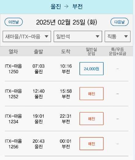| 07:03 (4대) | 울진 | 부전 | 약 3시간 15분 | 24,000 |