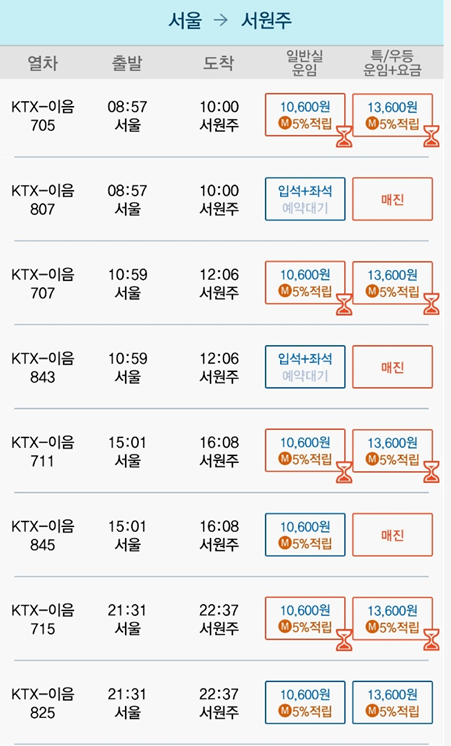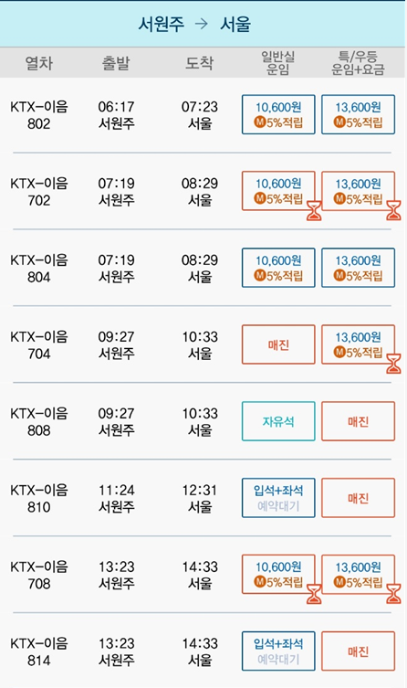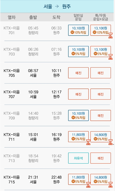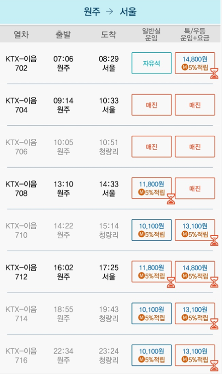 | 원주역 | 서울역 | 09:14 | 10:33 | 1시간 19분 | 11,800원 | 14800원 |