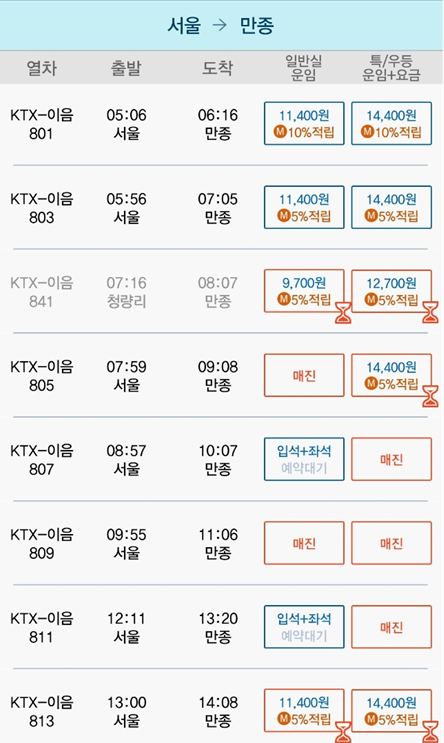 | 서울역 | 원주역 | 08:57 | 10:11 | 1시간 14분 | 11,800원 | 14800원 |