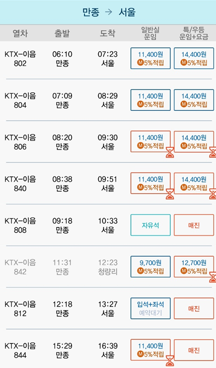 | 원주역 | 서울역 | 07:06 | 08:29 | 1시간 23분 | 11,800원 | 14800원 |