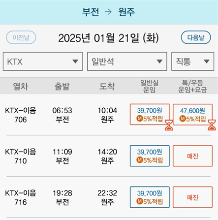 | 원주역 | 부전 | 3시간 7분 | 39700원 | 47600원 |