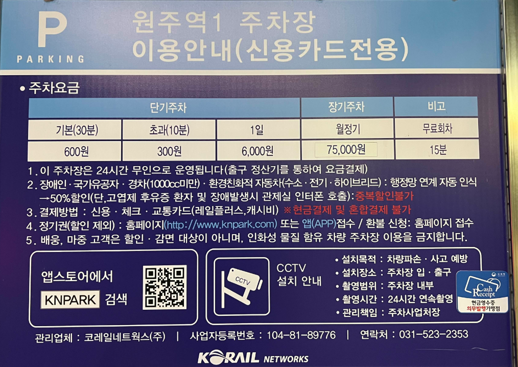 주차장 위치는 원주역 입구 바로 옆에 있어 접근성이 좋습니다.