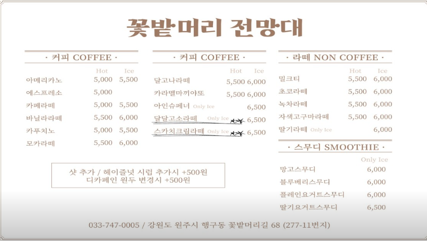 도로명 : 강원 원주시 꽃밭머리길 68 꽃밭머리 전망대 카페