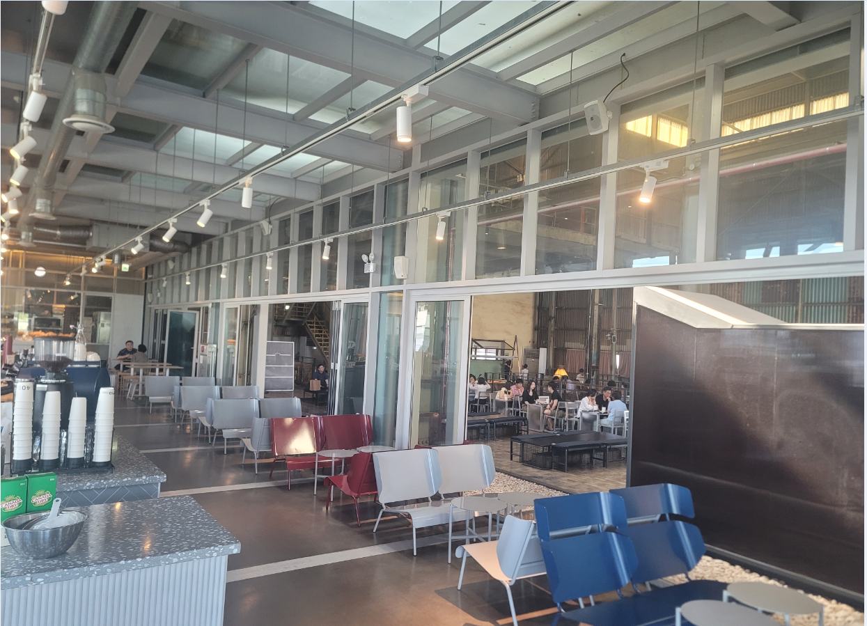- 외관: 붉은 벽돌과 철골 구조물, 공장 감성 그대로 살린 입구.