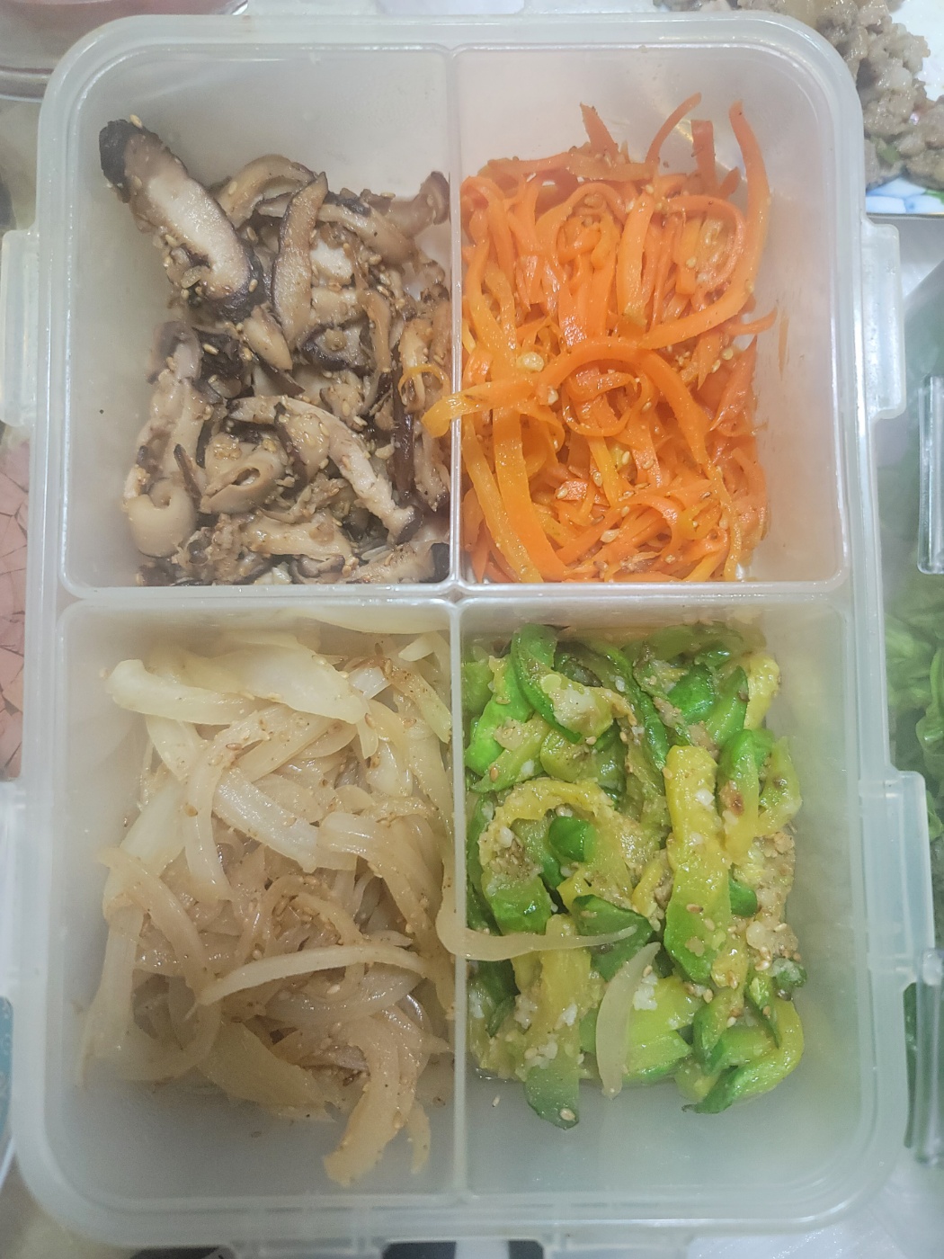 - 나물: 시금치, 고사리, 콩나물 등을 준비해 나물들을 각각 조리합니다. 제가 요리한 나물은 표고버섯, 당근, 양파, 호박, 상추, 콩나물, 시금치, 느타리버섯 입니다.