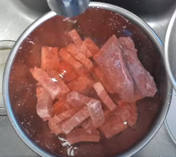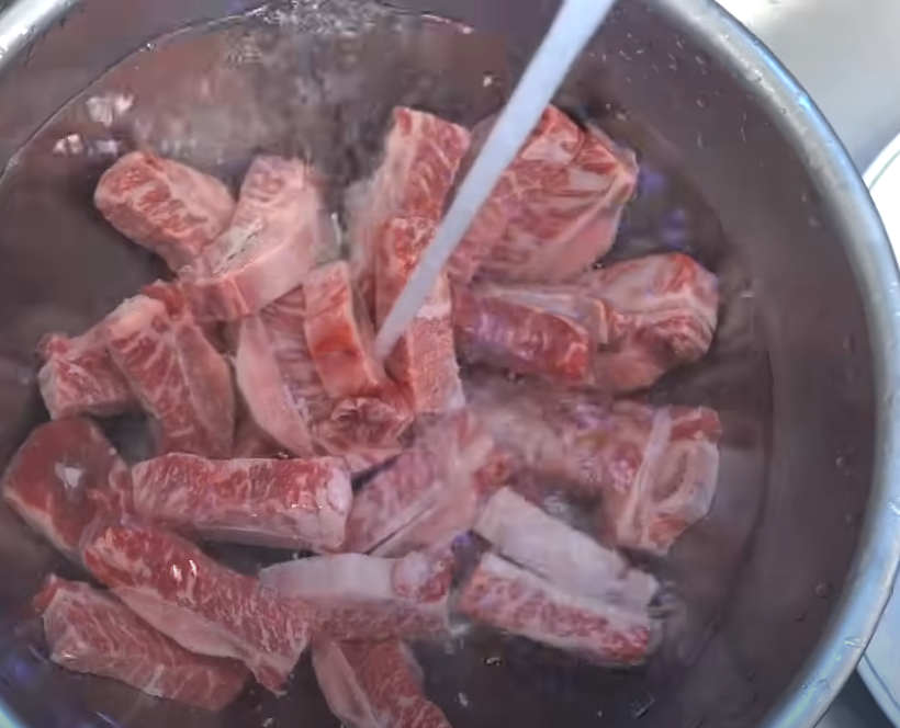 - 찬물에 3~4시간 담가 핏물을 빼냅니다. (1시간마다 물 교체).