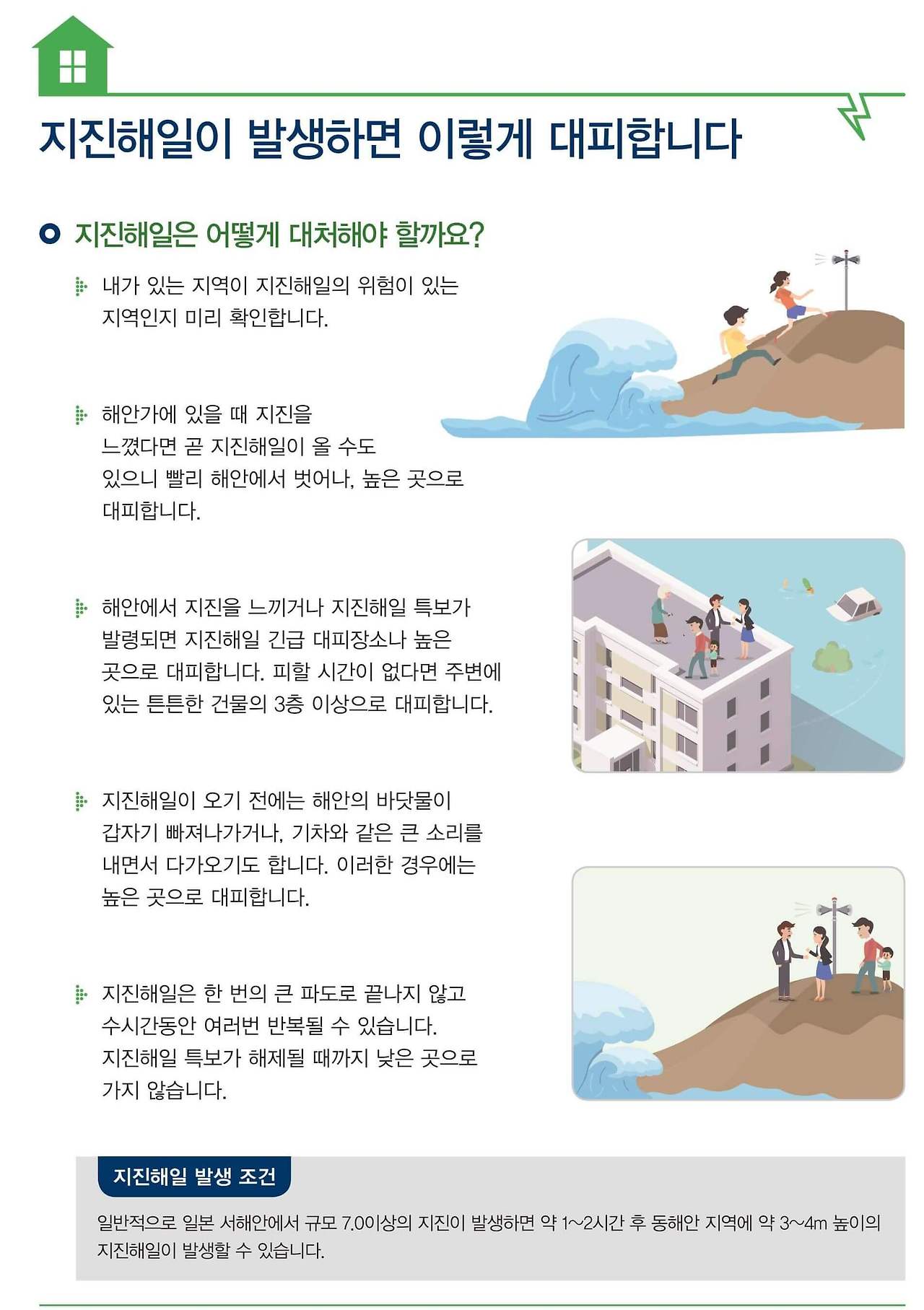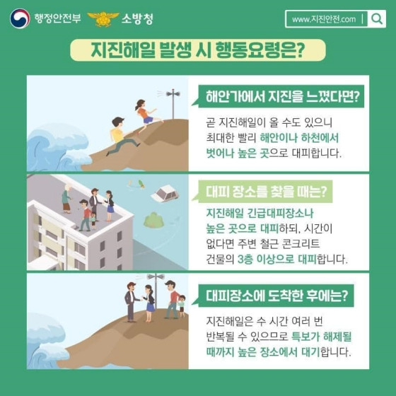 | 쓰나미 경보 | 경고 후 3~5분 이내 해일 도달 예상 | 즉시 '높은 지대로' 2차 대피, 자동차 이동 지양 |