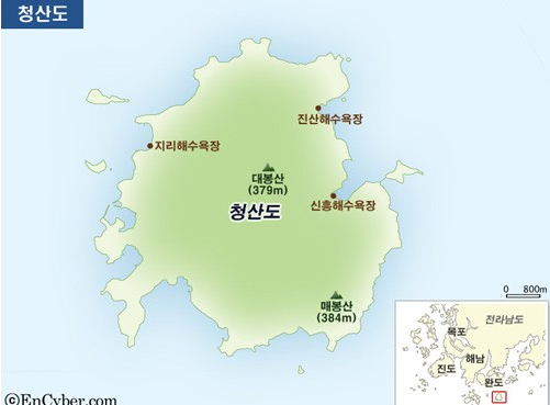 설명 : 위치는 동경 126˚53´ 북위 34˚11´이다. 해안선의 둘레는 85.6km이며 섬의 최고봉은 남쪽에 있는 해발 384m의 매봉산이며 북쪽의 대봉산은 379m로 두 번째로 높다. 완도에서는 남쪽으로 19km 떨어져 있으며 뱃길로는 45분이 소요된다. 공기가 맑고 산과 바다가 푸르러서 청산(靑山)이라고 불렀으며 한때는 신선이 살고있는 섬이라고 하여 선산(仙山)으로 부르기도 하였다.