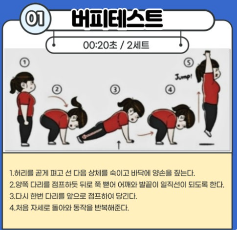 | 버피 테스트 🧨 | 고강도 유산소 | 약 150~180kcal | 15분 | 상 | 복부, 허벅지, 팔 |