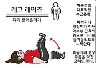 | 화요일 | 레그 레이즈 + 걷기 30분 (가볍게) | 약 200kcal |