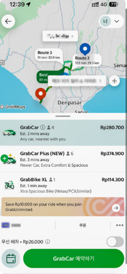 ✈️ 발리에서는 주로 GrabCar를 가장 많이 이용합니다. 오토바이(GrabBike)는 짧은 거리나 혼자 이동할 때 유용해요.