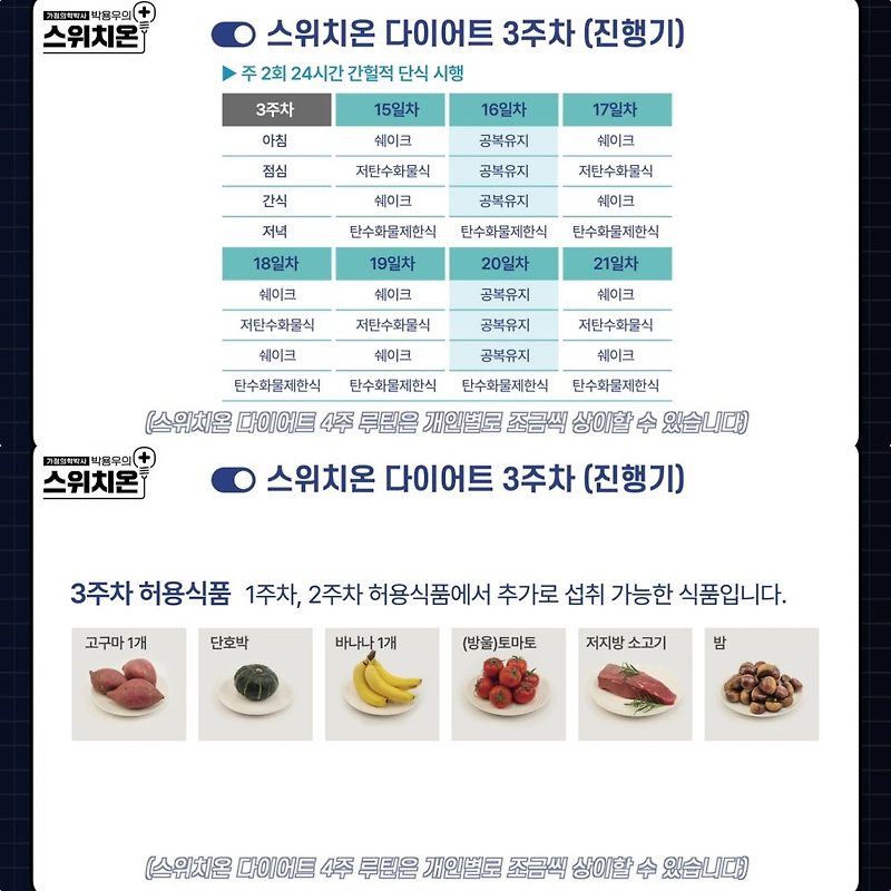 | 3주차 | 간헐적 단식 + 순환 | 16:8 간헐적 단식 | 고강도 운동 주 3회 |