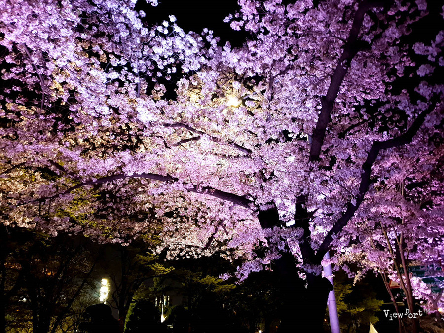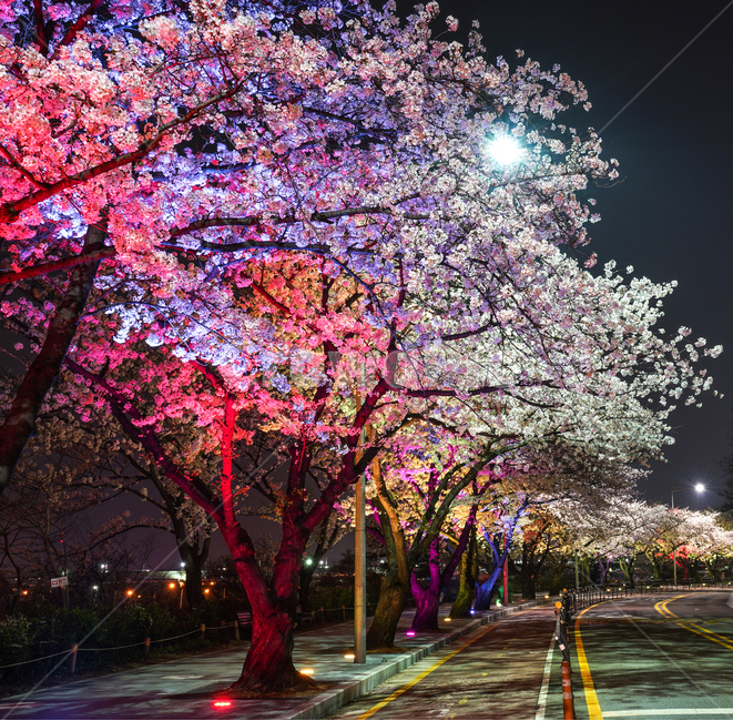- 서울 여의도 벚꽃축제 야경: 한강변 벚꽃길에 설치된 조명과 함께 빛나는 벚꽃들의 모습.