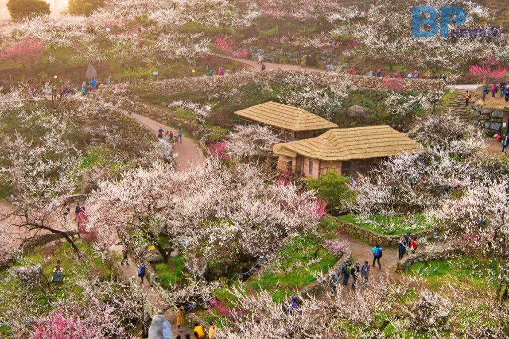 - 광양 매화축제 전경: 섬진강변을 따라 하얗게 펼쳐진 매화꽃과 방문객들의 모습이 어우러진 풍경.