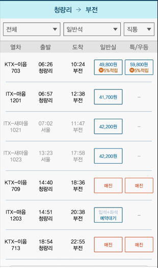 ★ 부전 → 청량리 (평일, 주말 시간표)