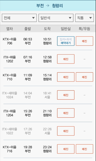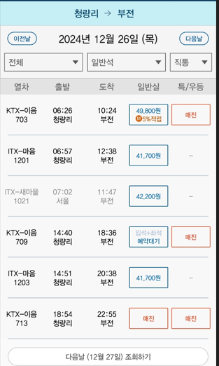 | 부전역 | 청량리역 | 06:00 | 22:00 | 약 4시간 |
