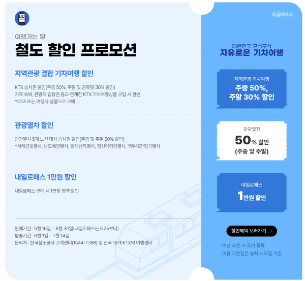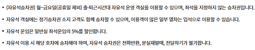 📣 이 상품은 열차별 승차율에 따라 운영하는 상품으로 고객이 원하는 시간대에 할인열차가 운행되지 않거나 할인좌석이 조기에 매진될 수 있으며, 할인율은 사전 공지없이 변경될 수 있습니다.