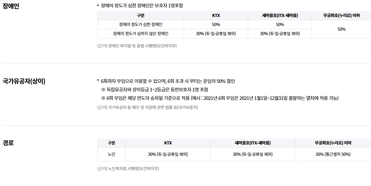 | 기초생활수급자 | 30% | 기초생활수급자 | 코레일 멤버십 인증 필요 |