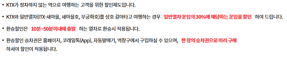 | 환승 할인 | 최대 30% | KTX+다른 교통수단 이용자 | 지정된 노선 적용 |