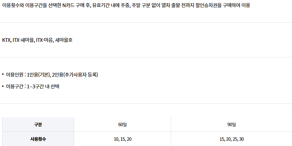 정기적으로 KTX를 이용하는 승객을 위한 정기승차권과 N카드를 통해 15~60%의 할인을 받을 수 있습니다. 이용 횟수와 기간에 따라 다양한 옵션이 제공됩니다. 자세한 내용은 코레일 홈페이지를 참고하시기 바랍니다.