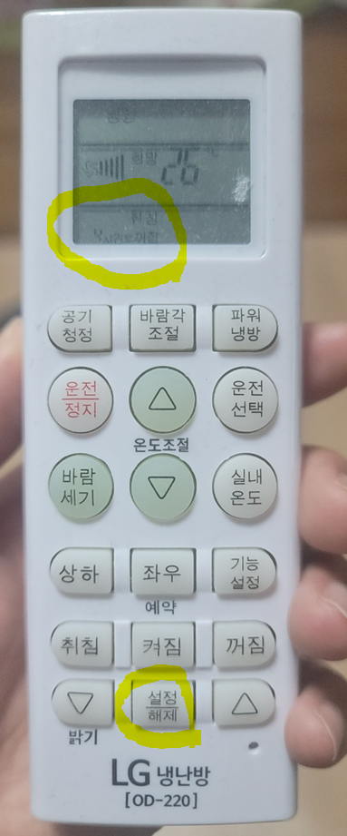 이미지 설명: 에어컨 리모컨 절전모드 및 타이머 버튼 위치